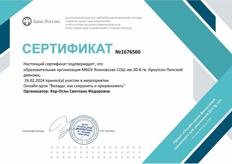 26 февраля 2024 года ребята 7 класса приняли участие в онлайн - уроке по финансовой грамотности «Вклады: как сохранить и приумножить», организованный Банком России. На уроке они узнали, что такое вклады, какие вклады бывают. Получив советы по выбору вкладов, ребята решали простые задачи на проценты по вкладам. Потом на уроке представитель банка подробно объяснил, что делать, если ваши права нарушены, куда надо обратиться.