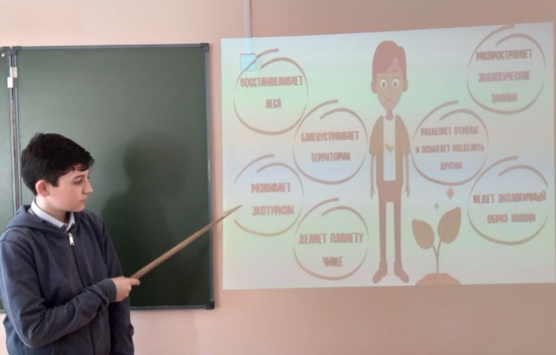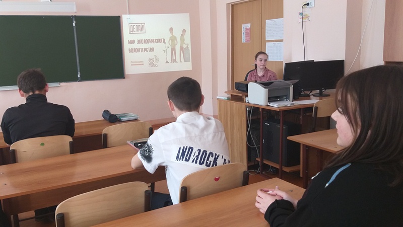 Участники акции провели урок на тему экологического волонтёрства. Обучающиеся узнали об актуальных экологических проблемах и возможных путях их решения, а также познакомились с рядом организаций, которые в данный момент занимаются экологическими вопросами в России.