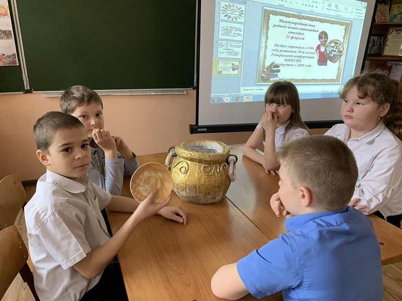 В течение всей недели в Ясиновской СОШ им. 30-й гв. Иркутско–Пинской дивизии проходили мероприятия, посвящённые Международному дню родного языка. Так, в преддверии замечательного праздника, учащиеся 3 класса отправились в увлекательное путешествие: узнали историю праздника, окунулись в историю нашего языка, вспомнили правила современного языка, узнали много интересного. Ребята активно участвовали в интересных конкурсах и викторинах. В ходе конкурса «Поговорка-цветочек, пословица-ягодка» ребята находили русский эквивалент иностранной пословицы. Из волшебного горшочка доставали предметы, которые угадывали по их описанию. С увлечением учащиеся из частей «собирали» пословицы. Особый интерес вызвал самый весёлый конкурс, где мальчикам и девочкам предстояло только лишь жестами и мимикой показать фразеологизмы. Ребята показали фразеологизмы «брать себя в руки», «как баран на новые ворота», «выйти из себя».
