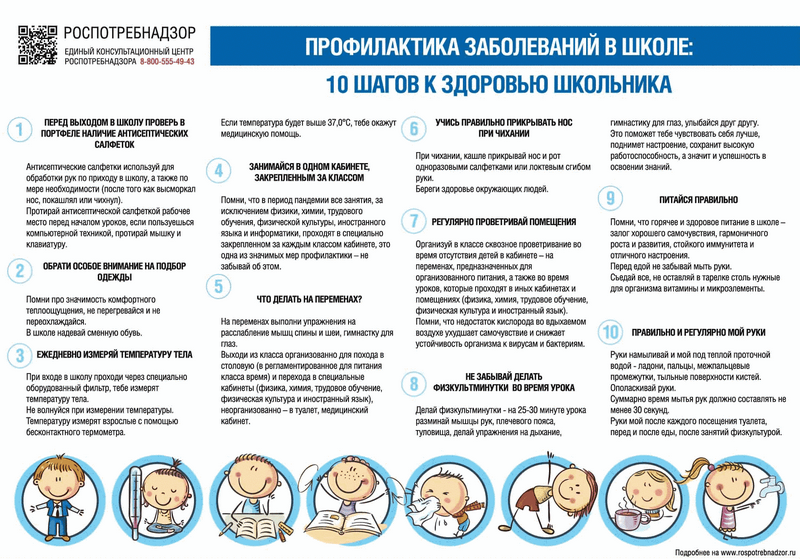 Для организации и проведения санитарно-просветительской работы среди детей и родительской общественности в рамках национального проекта «Демография» Роспотребнадзором разработана Памятка для детей по профилактике заболеваний в школе «10 шагов к здоровью школьника».