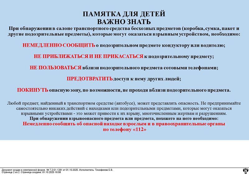 Межрегиональное территориальное Управление Федеральной службы по надзору в сфере транспорта по Южному Федеральному округу с целью обеспечения выполнения мер, направленных на обеспечение безопасных условий для перевозки детей, разработало памятку по соблюдению транспортной безопасности при перевозке групп детей школьными автобусами в период 2025-2026 учебного года.